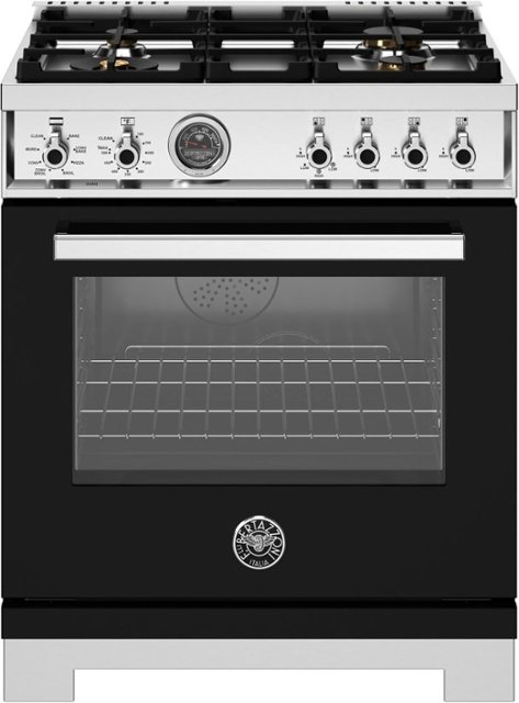 Loading... Please wait...30” Dual Fuel range has 4 brass burners and features 1 dual ring 19,000 BTU power-burners, 4.6 cubic feet self-cleaning oven, dual convection fan, 7 shelf levels, digital gauge, temperature probe, telescopic glides, soft-close doors, air-frying mode. All Bertazzoni appliances are covered by a 2-year warranty.