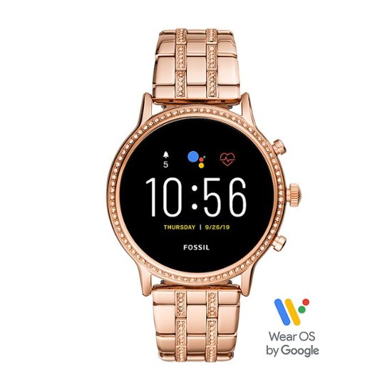 Keep time and stay connected with this rose gold Fossil Gen 5 Julianna HR smartwatch. The rechargeable battery offers up to a day of uptime, while three smart battery modes support multi-day use. This Fossil Gen 5 Julianna HR smartwatch uses Wear OS by Google, which lets you connect Android and iOS smartphones, and the voice-activated Google Assistant feature responds through the built-in speaker.