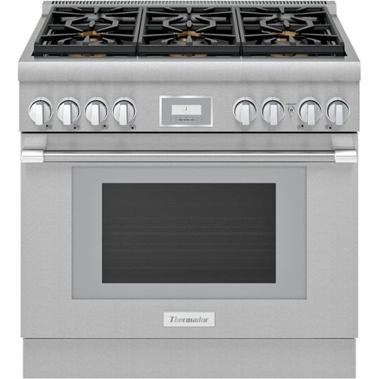 Loading... Please wait...The 36-inch Thermador Pro Harmony standard-depth duel-fuel range is Truly Flush Mounted with 6 Star Burners for added efficiency. The range is equipped with 2 Extralow Simmer burners that provide precise simmering capabilities. The Patented Star Burner is 56% longer than a round burner of the same size, enabling a superior flame spread for even heating and features a QuickClean Base designed for easy cleaning. The range has a two-hour self-cleaning mode to reduce cleanup time. WiFi smart appliance capabilities include remote preheating and monitoring via Home Connect app.