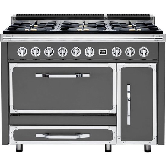 Loading... Please wait...Enjoy the Italian styling and commercial kitchen functionality of this Damascus Grey Viking Tuscany 48-inch range. The cooktop has six gas burners with different power outputs, providing versatility and control. The most powerful burner delivers 20,000 BTU for a very fast boil time. With a large left oven, smaller convection bake oven and eight cooking functions, this Viking Tuscany 48-inch range supports multiple food preparation scenarios.