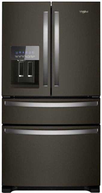 Keep ingredients organized on the five interior shelves of this 24.5 cu. ft. Whirlpool refrigerator. It has two humidity controlled crisper drawers to keep produce fresh, and bright LED lighting lets you see everything inside for quick access. This black stainless steel Whirlpool refrigerator has a built-in water filter and ice dispenser for added convenience.